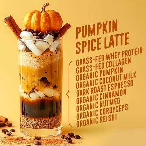 Whey Protein Concentrate (grass-fed, undenatured), Organic Banana Powder, Collagen (grass-fed), Organic Pumpkin Powder, MCT Oil Powder, Organic Coconut Milk Powder, Dark Roast Espresso Powder, Organic Cinnamon Powder, Unrefined Sea Salt, Organic Cordyceps Powder, Organic Reishi Powder, Organic Nutmeg Powder, Organic Stevia Leaf Extract, Organic Monk Fruit Extract